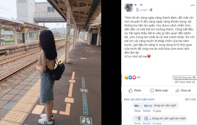 Đáng chú ý nhất là dòng status của cô khiến nhiều người xem như điềm báo cho việc chẳng lành. Dòng tâm trạng: "Đôi khi, việc tốt nhất và duy nhất ta có thể làm, là bước lùi lại trước tất cả những gì đang diễn ra, đi đến một nơi nào đó thật xa, cho bản thân một cơ hội để thở...", được cô gái sinh năm 1998 viết trước khi tai nạn xảy ra chưa đầy 1 tuần. Cùng với status là tấm ảnh Phan Thị M. quay lưng đi, chỉ thấy hình bóng chiếc lưng và mái tóc buông xõa ngang vai.