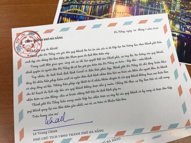 Trong tâm thư, ông Chinh thay mặt chính quyền TP Đà Nẵng trân trọng cảm ơn các vị khách du lịch đã lựa chọn Đà Nẵng làm điểm đến của mình. Đồng thời, lấy làm tiếc và rất mong nhận được sự cảm thông, chia sẻ trước những bất tiện do dịch bệnh gây ra. Đà Nẵng mong muốn được đón khu khách trong thời gian tới.
