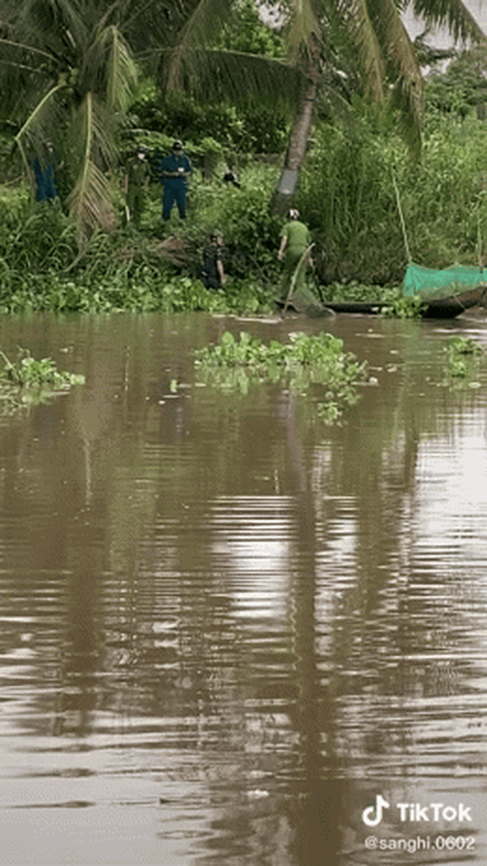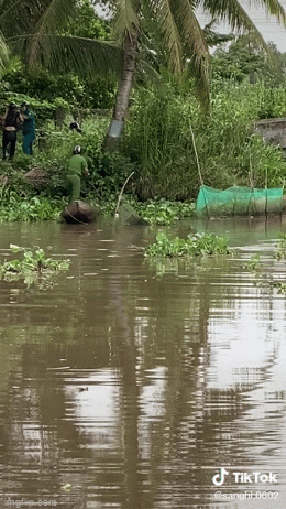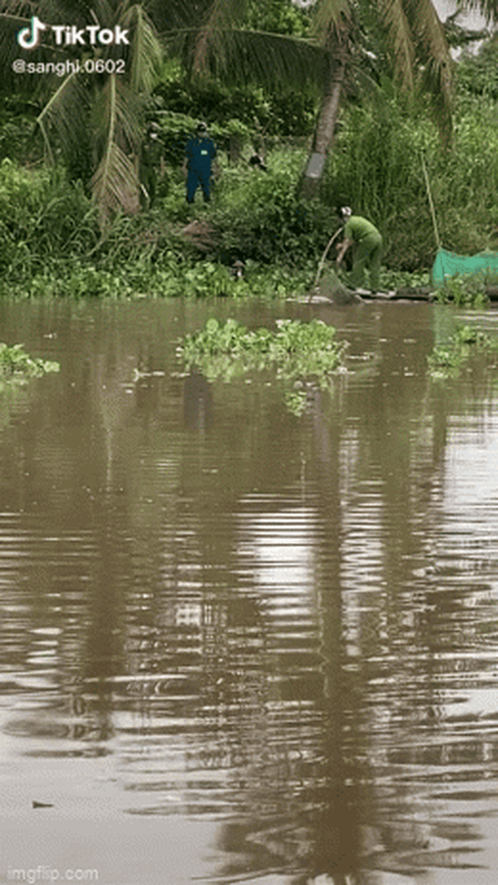Vậy nhưng lực lượng chức năng đã nhanh chóng đuổi theo đến cùng. Một công an đã làm hành động không ai tin được, đó là chèo chiếc thuyền nhỏ trên dòng nước lênh đênh ra tận nơi người vi phạm đang "trú ẩn". Phía trên bờ, các thành viên khác đã đứng sẵn để đợi.