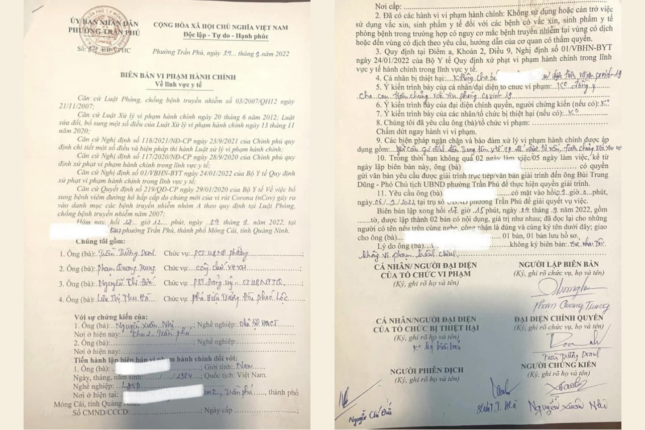 Cũng trong biên bản, người vi phạm nêu lý do là không đồng ý cho con tiêm chủng vắc xin phòng Covid-19. UBND phường Trần Phú yêu cầu gia đình đến Trung tâm y tế TP Móng Cái để được tư vấn tiêm chủng vắc xin Covid-19.