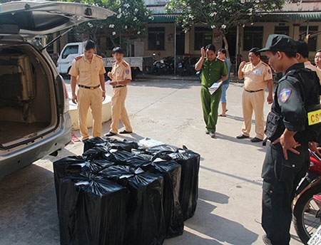 Qua kiểm tra, Đội Cảnh sát giao thông số 2 phát hiện trên xe có 2 biển số giả và trên 5.400 bao thuốc lá ngoại.