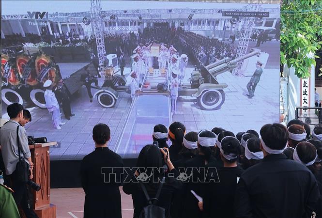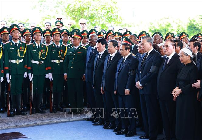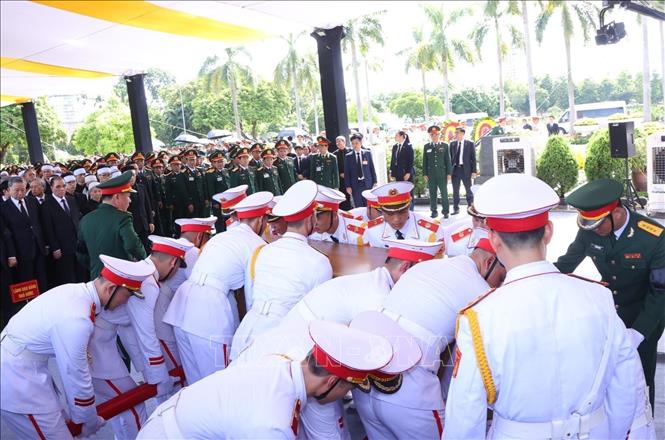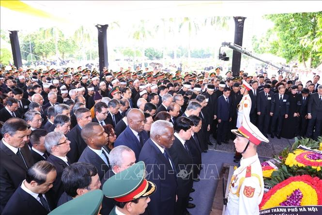 Các đồng chí lãnh đạo, nguyên lãnh đạo Đảng, Nhà nước, Mặt trận Tổ quốc Việt Nam, đồng chí, đồng bào, bạn bè quốc tế và gia đình đã đi vòng quanh mộ vĩnh biệt Tổng Bí thư Nguyễn Phú Trọng, Nhà lãnh đạo đặc biệt xuất sắc, một tấm gương sáng ngời về học tập, làm theo tư tưởng, đạo đức, phong cách Hồ Chí Minh, người đảng viên cộng sản kiên trung, có uy tín lớn của Đảng, Nhà nước và Nhân dân ta.