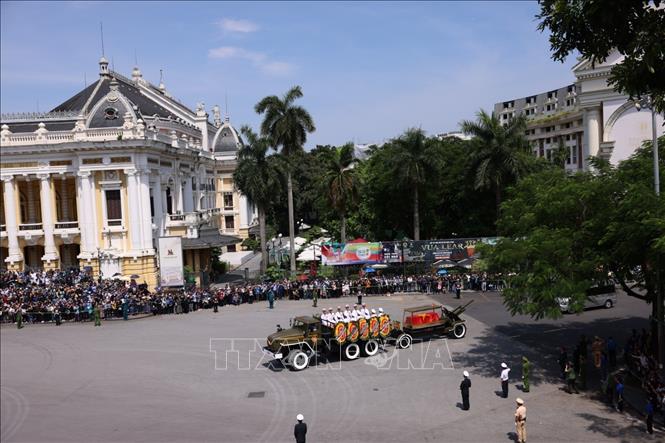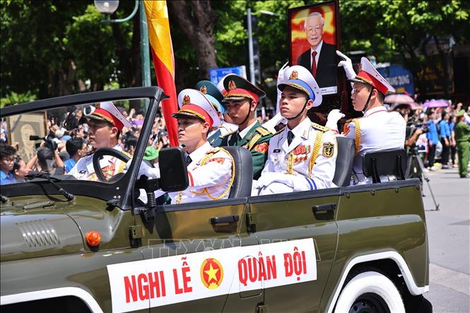 Trong nền nhạc trầm hùng của bài "Hồn tử sĩ", các đồng chí lãnh đạo, nguyên lãnh đạo Đảng, Nhà nước đã đưa linh cữu Tổng Bí thư Nguyễn Phú Trọng ra linh xa, tiễn đưa đồng chí về nơi an nghỉ cuối cùng.
