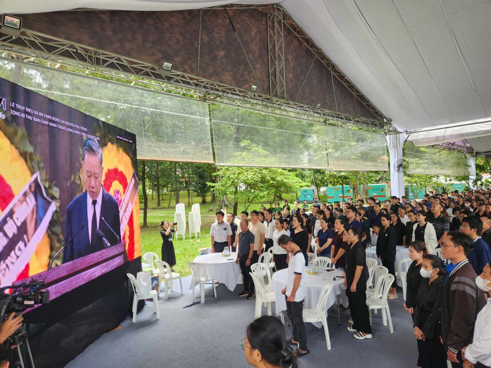 Trong niềm tiếc thương sâu sắc, các đồng chí lãnh đạo, nguyên lãnh đạo Đảng, Nhà nước, Mặt trận Tổ quốc Việt Nam, đồng chí, đồng bào, bạn bè quốc tế và gia đình dành một phút mặc niệm vĩnh biệt Tổng Bí thư Nguyễn Phú Trọng, một trí tuệ lớn, tài năng lớn của cách mạng Việt Nam, đã cống hiến trọn đời mình cho sự nghiệp cách mạng của Đảng và dân tộc ta.