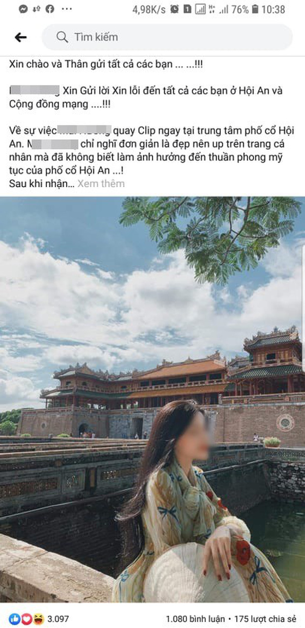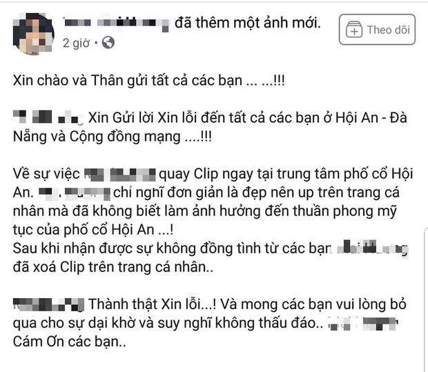 Theo đó, nữ chính trong câu chuyện khiến dư luận bức xúc này, chia sẻ trên facebook cá nhân: "Xin chào và thân gửi tất cả các bạn ! M.H xin gửi lời xin lỗi đến tất cả các bạn ở Hội An - Đà Nẵng và cộng đồng mạng...!!!