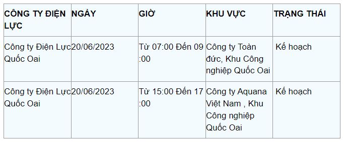 Theo đó, trong ngày 20/6, EVNHANOI sẽ có kế hoạch tạm ngừng cấp điện một số huyện ngoại thành.