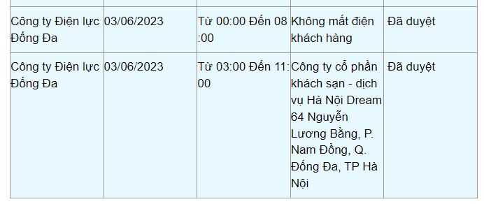Ngoài ra, việc cung cấp dịch vụ tại Công ty cổ phần khách sạn - dịch vụ Hà Nội Dream (64 Nguyễn Lương Bằng, phường Nam Đồng, quận Đống Đa) sẽ bị ảnh hưởng do mất điện.