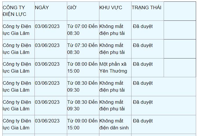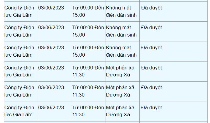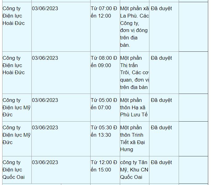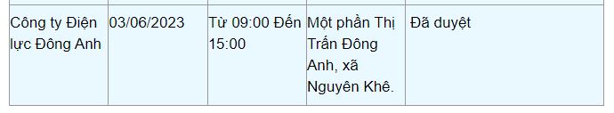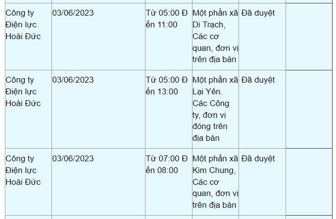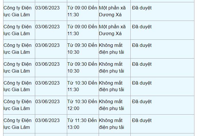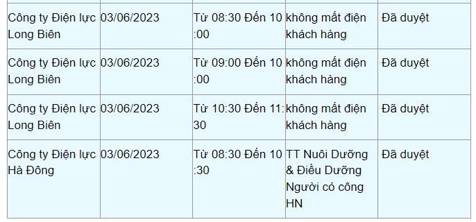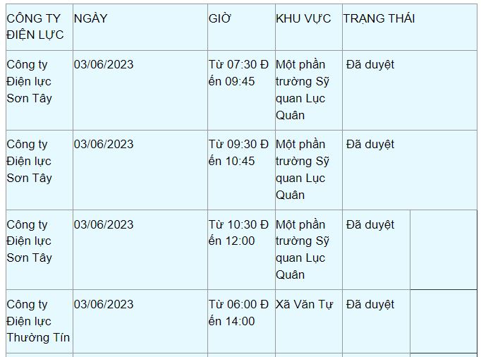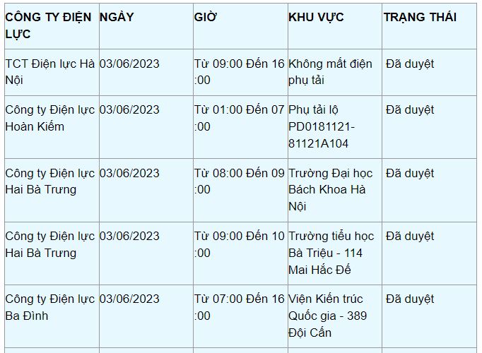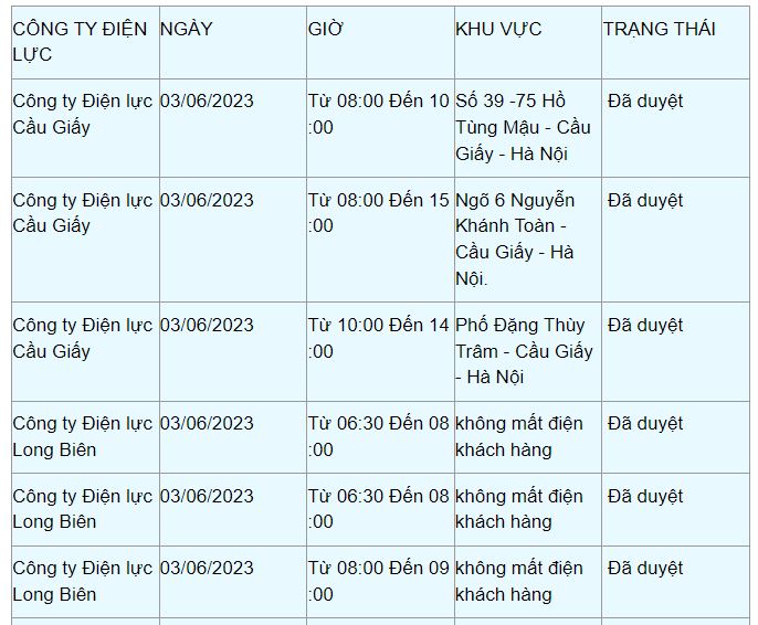 Theo thông tin từ trang web chính thức của Tổng công ty Điện lực Hà Nội (EVNHANOI), ngày 3/6 sẽ diễn ra kế hoạch cắt điện tại nhiều địa điểm trên toàn thành phố.