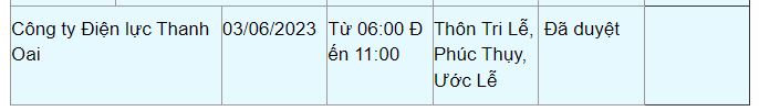 Cụ thể, số 39 -75 Hồ Tùng Mậu, ngõ 6 Nguyễn Khánh Toàn, phố Đặng Thùy Trâm (quận Cầu Giấy) sẽ tạm ngừng cung cấp điện trong khoảng thời gian từ 2 đến 7 tiếng; thôn Trí Lễ, Phúc Thuy, Ước Lễ (huyện Thanh Oai) sẽ mất điện từ 6h đến 11h; một phần xã La Phù (huyện Hoài Đức) cũng mất điện trong 4 tiếng.