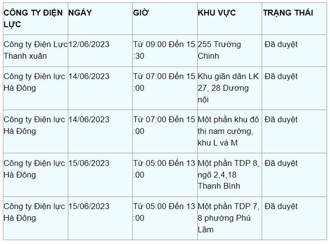 Lịch cắt điện quận Thanh Xuân, Hà Đông