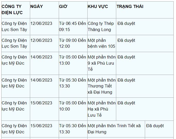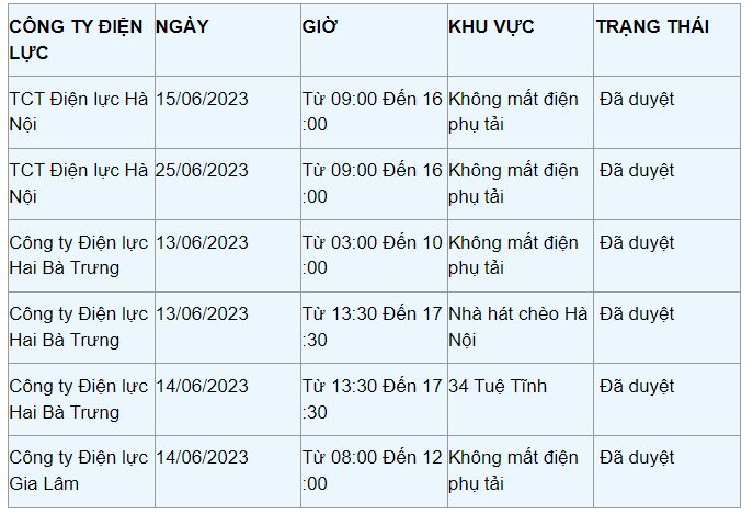 12/06/2023 18:07Lịch cắt điện Hà Nội tuần này (12/6 – 18/6): Bất ngờ giảm số lượng nơi mất điện, dân nội thành mừng như trúng số khi xem danh sách này