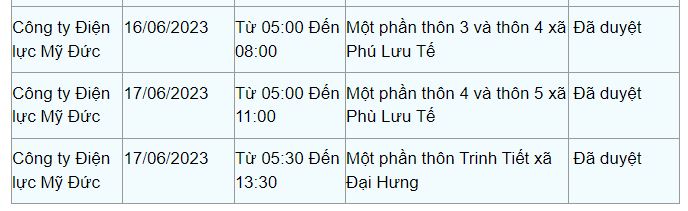 Lịch cắt điện Thị xã Sơn Tây, huyện Mỹ Đức