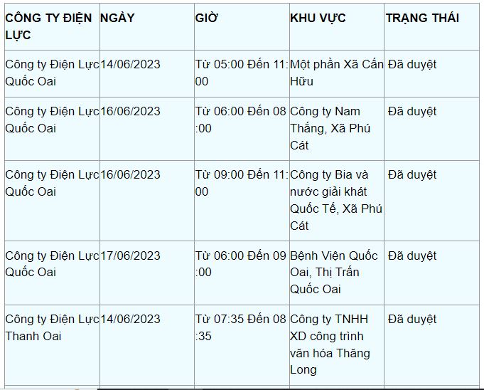 Lịch cắt điện huyện Quốc Oai, Thanh Oai