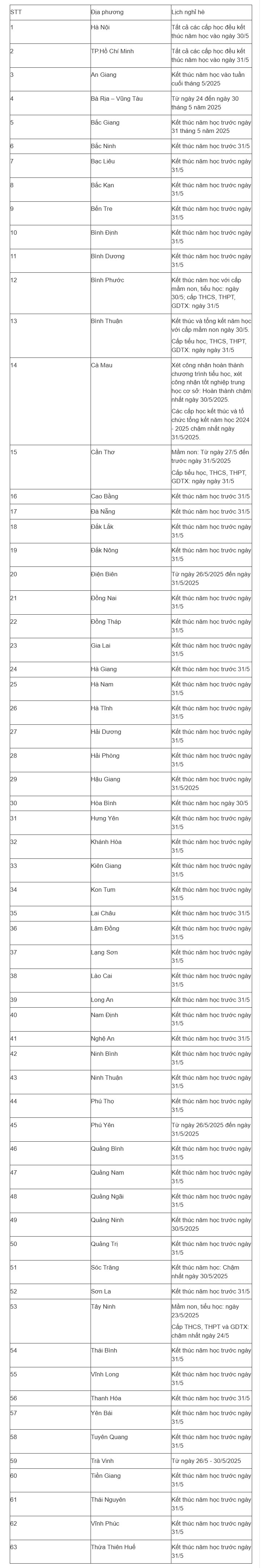 Theo quy định trên, các địa phương phải hoàn thành chương trình và kết thúc năm học trước ngày 31/5/2025. Tuy nhiên, thời gian cụ thể có thể khác nhau giữa các tỉnh, thành phố tùy theo điều kiện thực tế và kế hoạch riêng của từng địa phương.