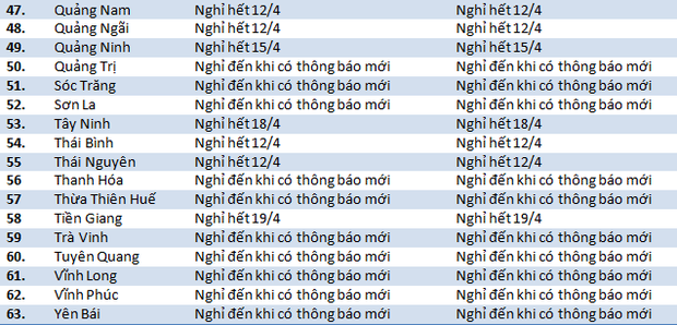11/04/2020 03:45Lịch nghỉ học của 63 tỉnh thành: Một số địa phương tiếp tục thay đổi thời gian nghỉ