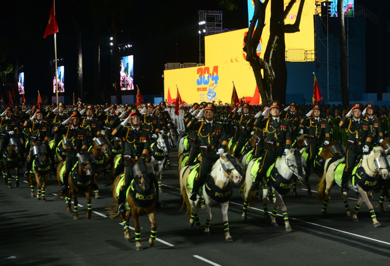 Vào tối 30/4, đường Nguyễn Huệ sẽ trở thành sân khấu sôi động với hai hoạt động đặc biệt: diễu hành kỵ binh do lực lượng Cảnh sát cơ động thực hiện (19 giờ - 19 giờ 25 phút) và màn đồng diễn “Vũ điệu khăn rằn” phong cách tương tác cộng đồng (bắt đầu lúc 19 giờ).