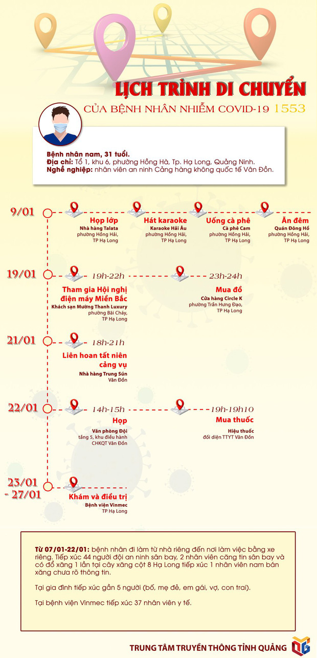 14h đến 15h ngày 21/1, bệnh nhân đi họp tại văn phòng đội (tầng 5, khu điều hành Cảng hàng không quốc tế Vân Đồn). 19h10 cùng ngày, người này mua thuốc tại hiệu thuốc đối diện Trung tâm y tế huyện Vân Đồn.