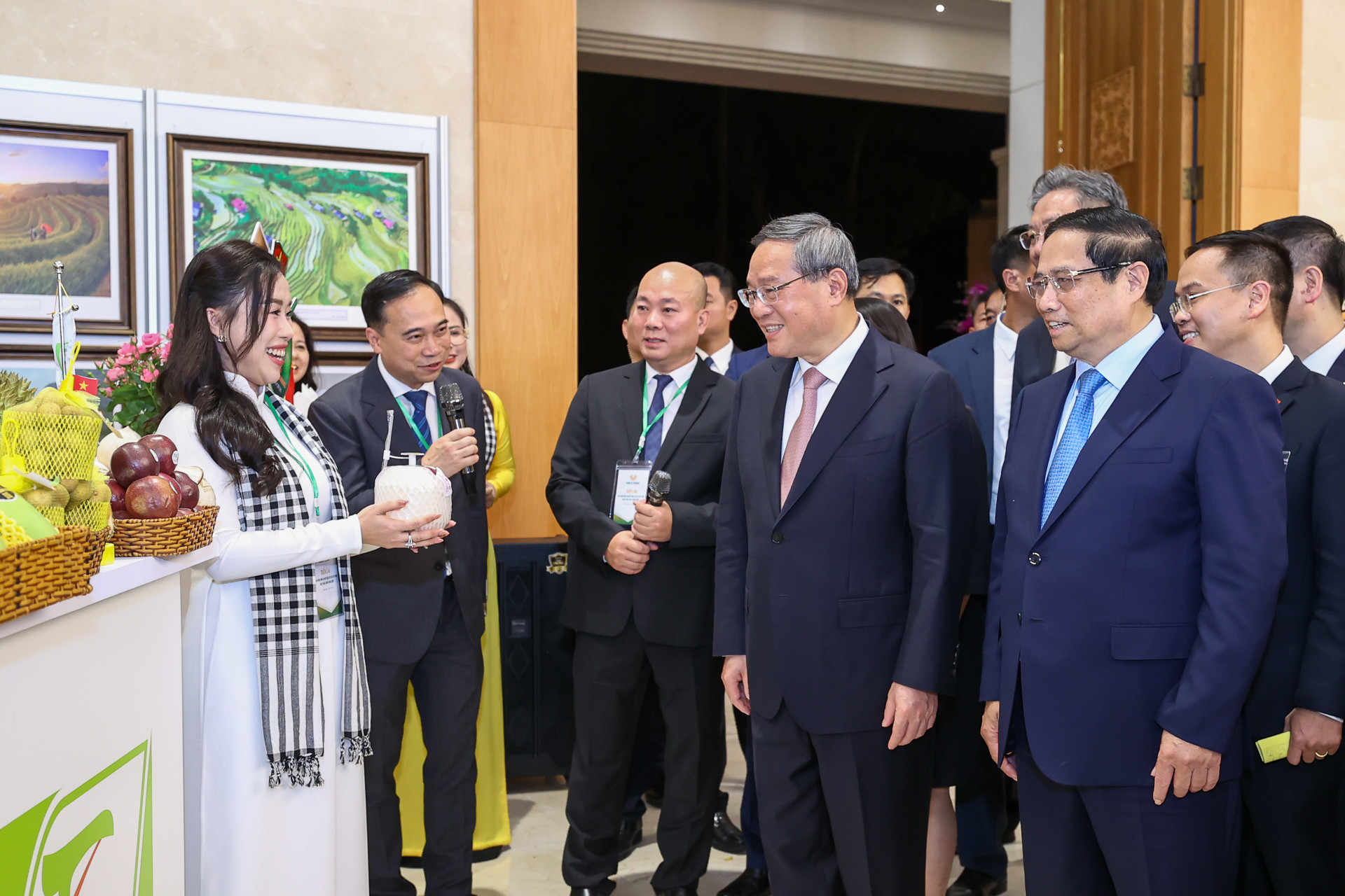 Sau khi thưởng lãm tranh Đông Hồ, Thủ tướng Phạm Minh Chính và Thủ tướng Lý Cường tham quan trưng bày một số sản phẩm nông nghiệp đặc sắc của Việt Nam xuất khẩu sang Trung Quốc như: Yến sào, sầu riêng, dừa tươi, chuối, cà phê, sữa… Đây là những sản phẩm tiêu biểu trong 14 mặt hàng nông sản xuất khẩu chính ngạch sang thị trường Trung Quốc.