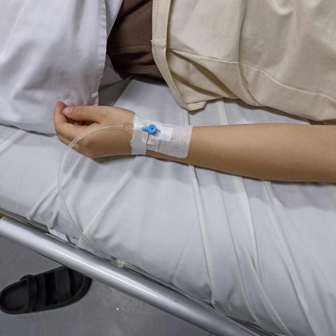 Sau đó sang sáng 30/6, mình thấy bụng đau quằn quại từng cơn, miệng nôn chôn tháo. Người thân đưa mình đến cấp cứu tại bệnh viện thì ban đầu xét nghiệm cho kết quả nhiễm khuẩn đường ruột, lượng bạch cầu trong máu tăng lên gấp nhiều lần. Bệnh viện yêu cầu mình nằm viện để theo dõi vì sợ gặp thêm biến chứng. Tính đến nay mình đã nằm viện 4 ngày, hàng ngày truyền liên tục kháng sinh và truyền nước, phải làm thêm các xét nghiệm máu, X-quang, siêu âm và nội soi.