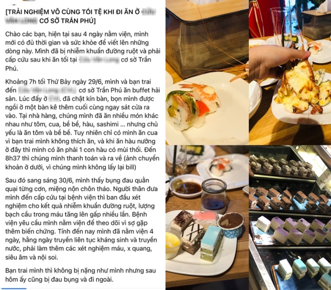 Cụ thể H.T. chia sẻ: "Khoảng 7h tối thứ bảy (ngày 29/6), mình và bạn trai nhà hàng tại cơ sở Trần Phú ăn buffet hải sản. Tại nhà hàng, chúng mình đã ăn nhiều món khác nhau như tôm, cua, bề bề, hàu, sashimi … nhưng chủ yếu là ăn tôm và bề bề. Tuy nhiên chỉ có mình ăn cua vì bạn trai mình không thích ăn, và khi ăn hàu nướng ở đây thì mình có ăn phải 1 con hàu có mùi thối. Đến 8h37 thì chúng mình thanh toán và ra về.