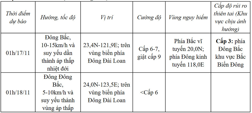 Khoảng sáng sớm 18/11, bão Man-yi sẽ vượt qua đảo Lu Dông vào Biển Đông. Đến 1h sáng 18/11, tâm bão trên vùng biển phía Đông khu vực Bắc Biển Đông với cường độ còn khoảng cấp 12-13, giật cấp 16.