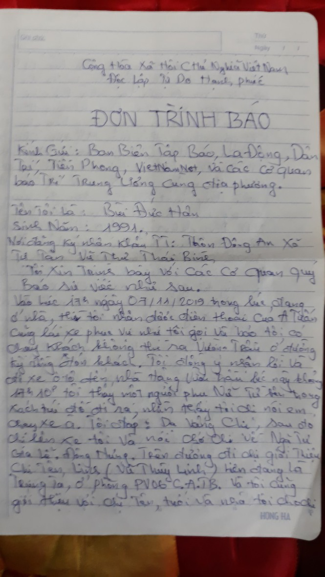 Nội dung đơn cho biết, khoảng hơn 17 giờ chiều ngày 7/11, anh Hân có nhận được điện thoại của đồng nghiệp giới thiệu khách gọi xe và đón một người phụ nữ tại nhà hàng VT tại thành phố Thái Bình.