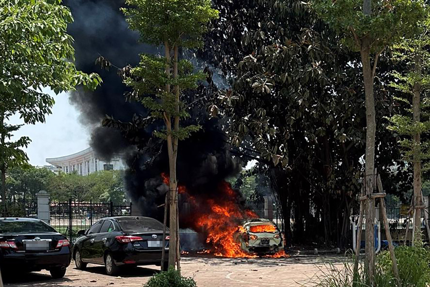 Đến 12h cùng ngày, ô tô mang biển số 30K-227.XX đang đỗ trong khuôn viên của Trung tâm thể dục thể thao quận Ba Đình cũng bất ngờ bốc cháy.