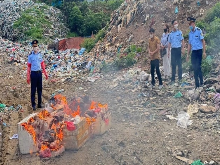 Kiểm tra phát hiện 450kg thịt lợn chứa trong 7 thùng xốp, có màu sắc thâm đen, bốc mùi hôi thối, đang trong quá trình phân hủy. Lái xe không xuất trình được hóa đơn, chứng từ chứng minh nguồn gốc.