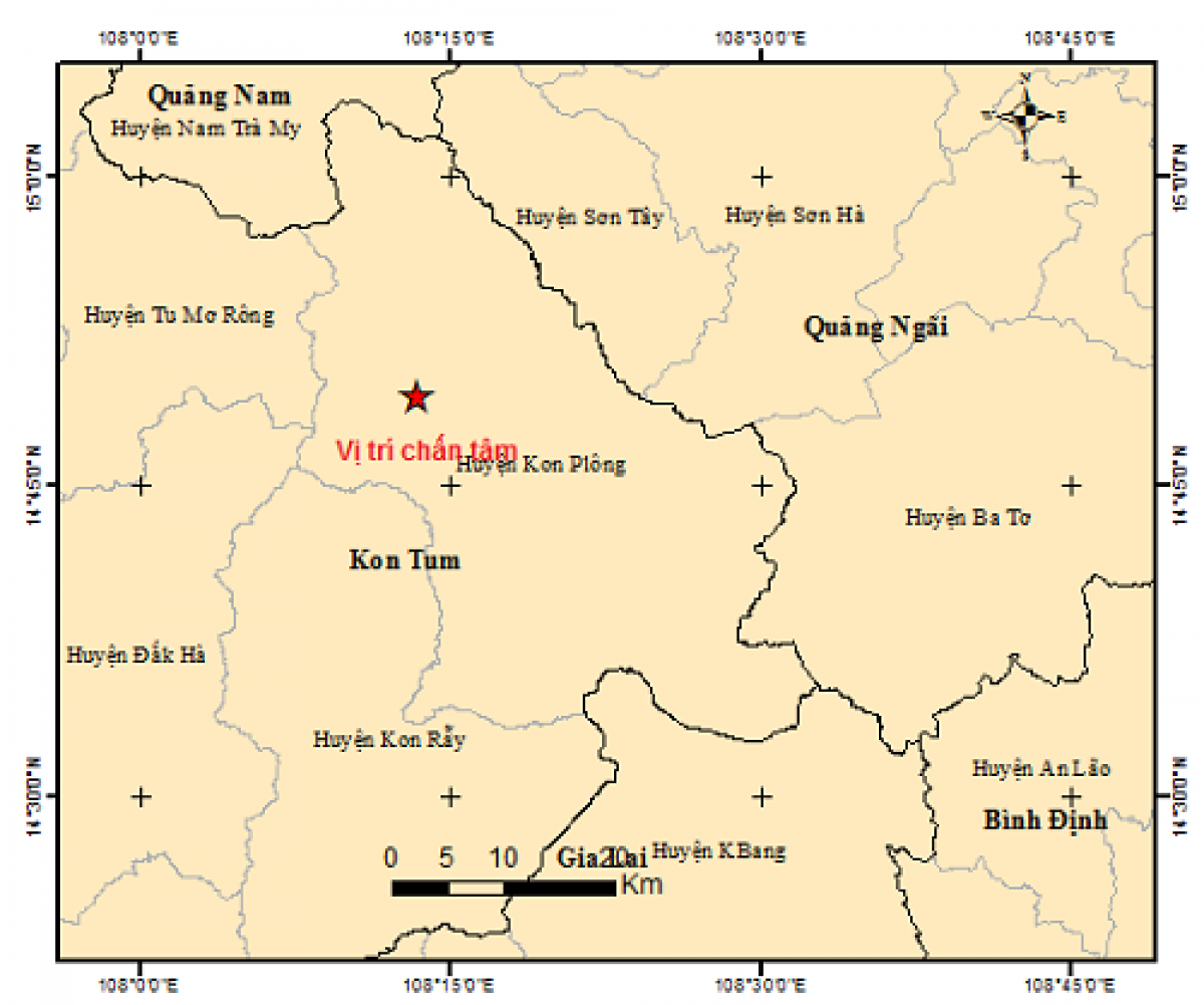 Theo đó, vào lúc 20h ngày 15/4, một trận động đất mạnh 2,9 độ (độ sâu chấn tiêu 8,1 km) đã xảy ra tại khu vực huyện Kon Plông, tỉnh Kon Tum.