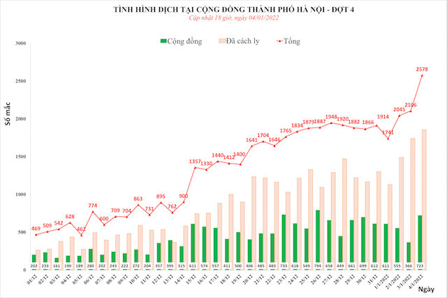 Ngày 4/1, Hà Nội lại lập đỉnh mới với 2. 578 ca mắc Covid-19, trong đó 723 ca ngoài cộng đồng, đây là ngày có số ca mắc cao nhất từ trước đến nay, vượt mốc 2.500 ca. Trước đó, liên tiếp từ ngày 15/12 trở lại đây, Thủ đô ghi nhận số ca mắc mới tăng liên tục, trung bình từ 1.000- 2.000 ca/ngày.