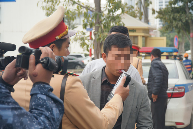 Vừa bước chân ra khỏi quán ăn, anh N.T.H (35 tuổi, ở Hà Đông, Hà Nội) bị lực lượng chức năng yêu cầu dừng xe và thổi nồng độ cồn tại ngã tư Huỳnh Thúc Kháng – Nguyễn Chí Thanh (quận Đống Đa, Hà Nội).