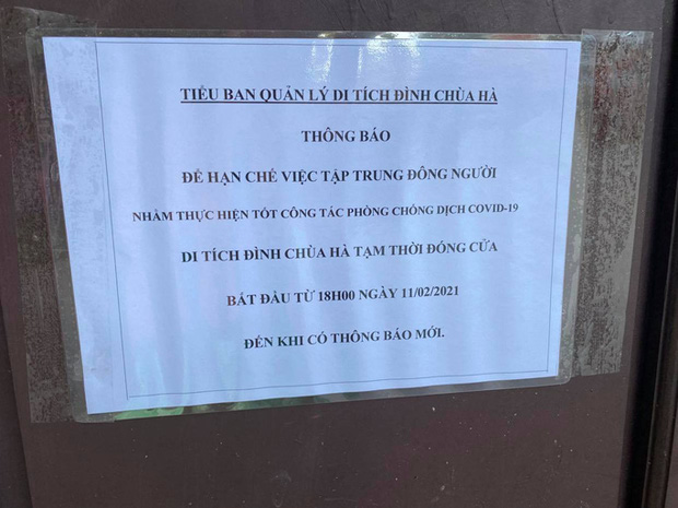 Ngày 11-2, nhiều người dân Hà Nội đi lễ chùa Hà cuối năm khá bất ngờ khi thấy cổng chùa Hà dán thông báo đóng cửa đình - chùa Hà từ 18 giờ ngày 11-2 để thực hiện công tác phòng chống dịch Covid-19.