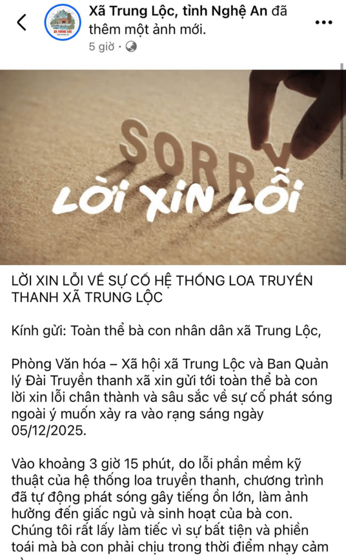 05/12/2025 15:56"Lỡ" phát loa truyền thanh lúc 3h sáng, chính quyền vội vàng đăng đàn xin lỗi người dân, thông báo lý do xảy ra sự cố