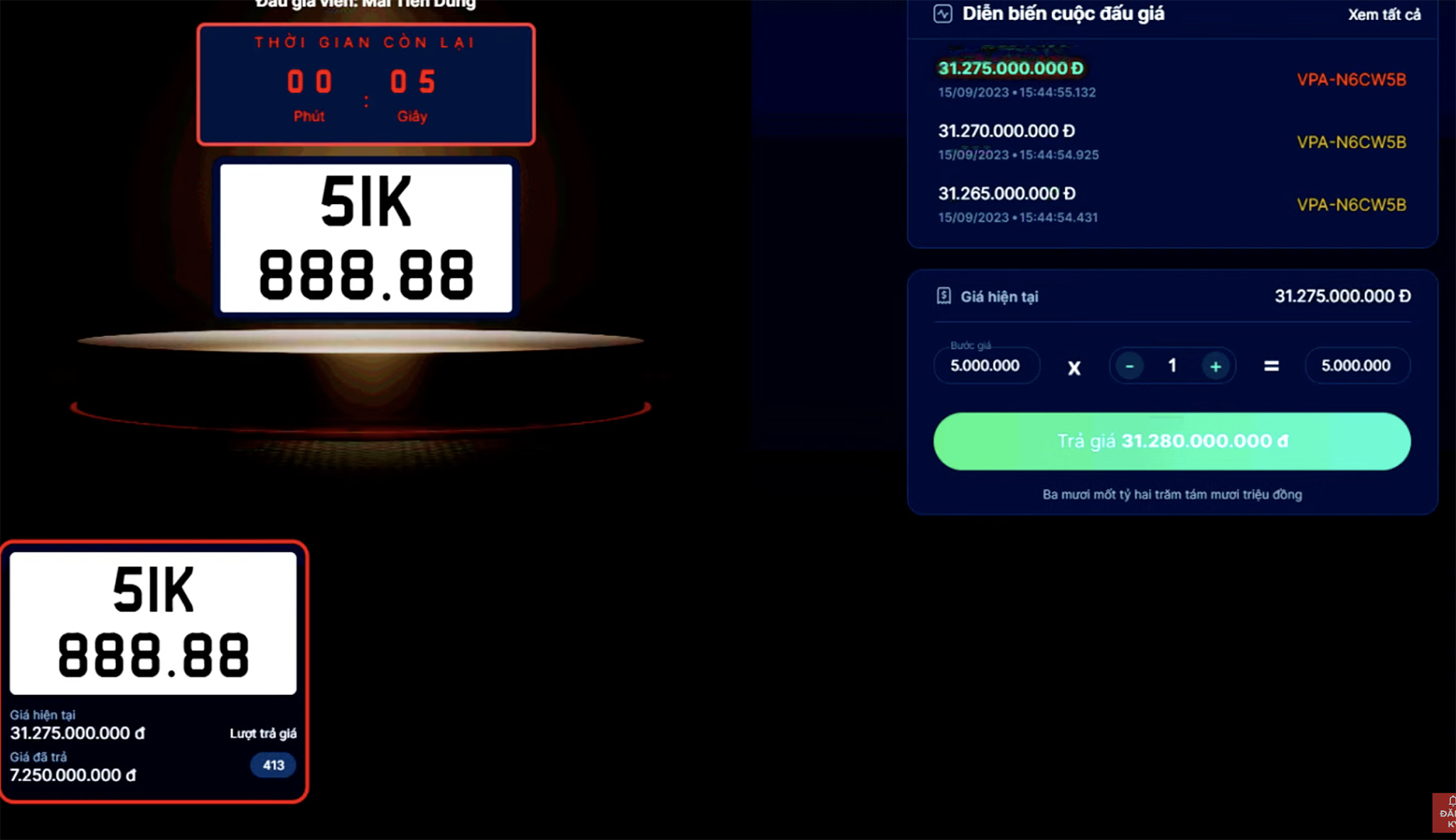 Chốt phiên đấu giá vào 9h cùng ngày, biển số "siêu đẹp" này được chốt với số tiền 15,265 tỷ đồng sau hơn 1.000 lượt trả. Với lần đấu giá lại này, biển số giảm hơn một nửa giá trị.