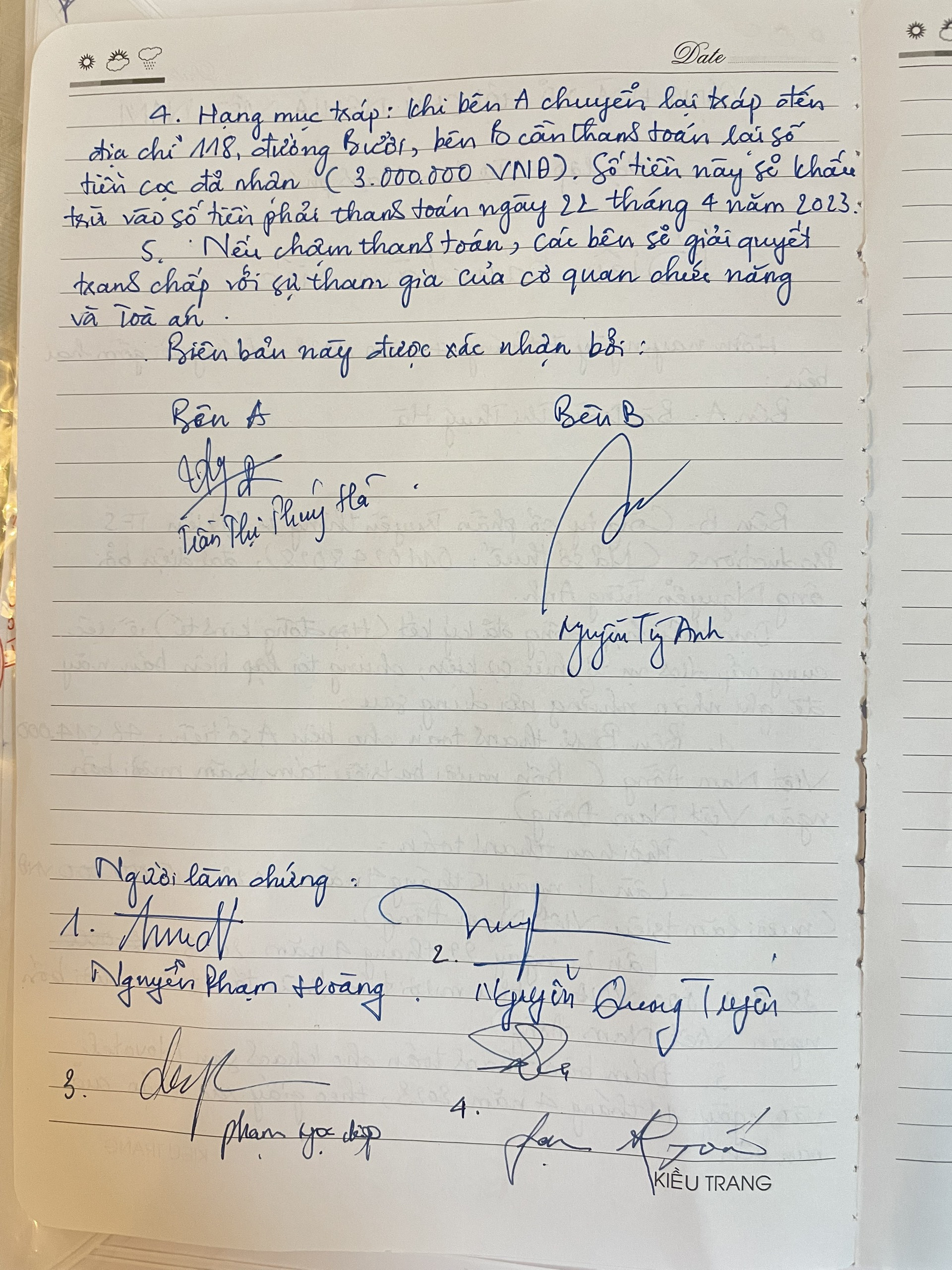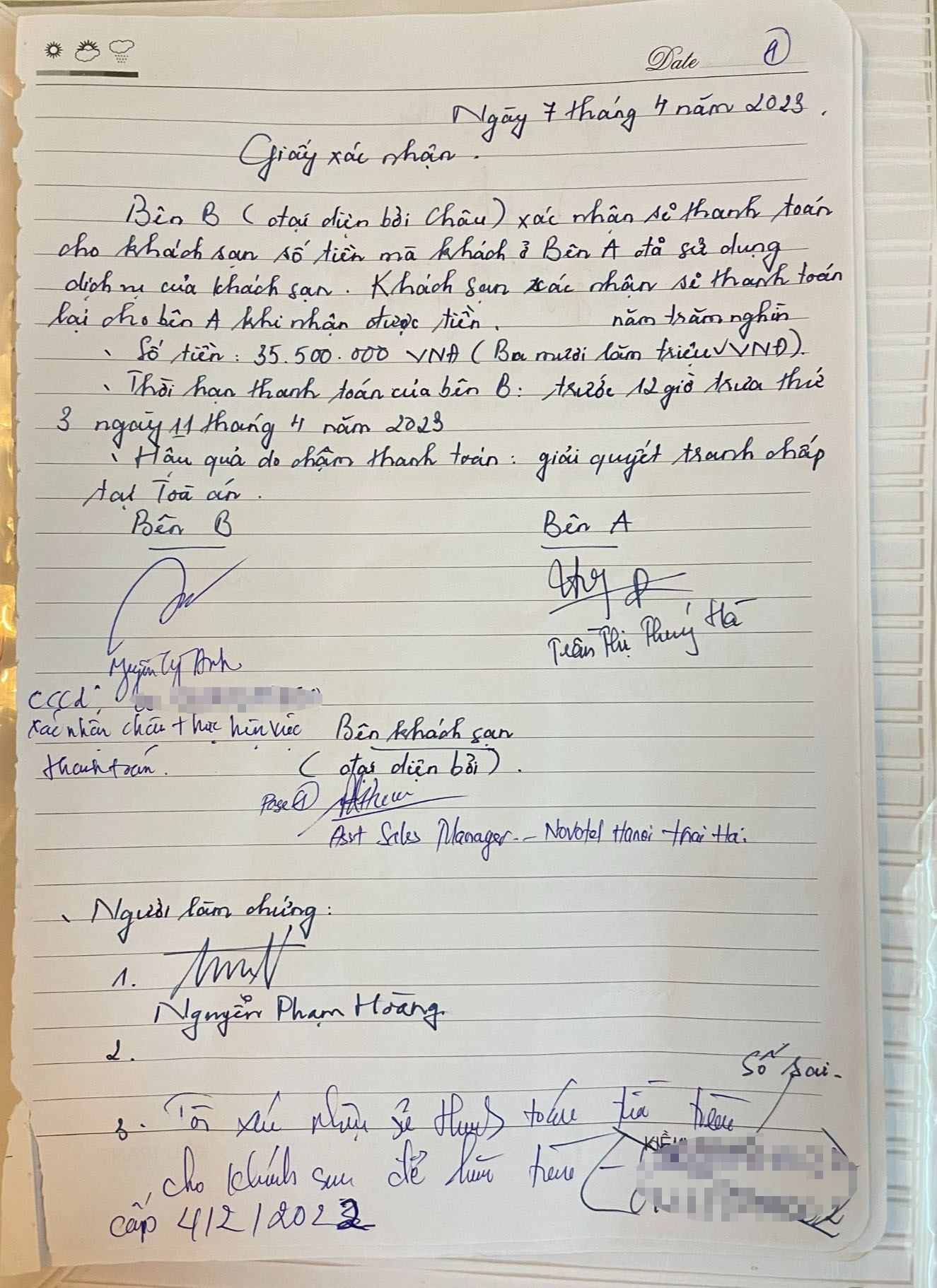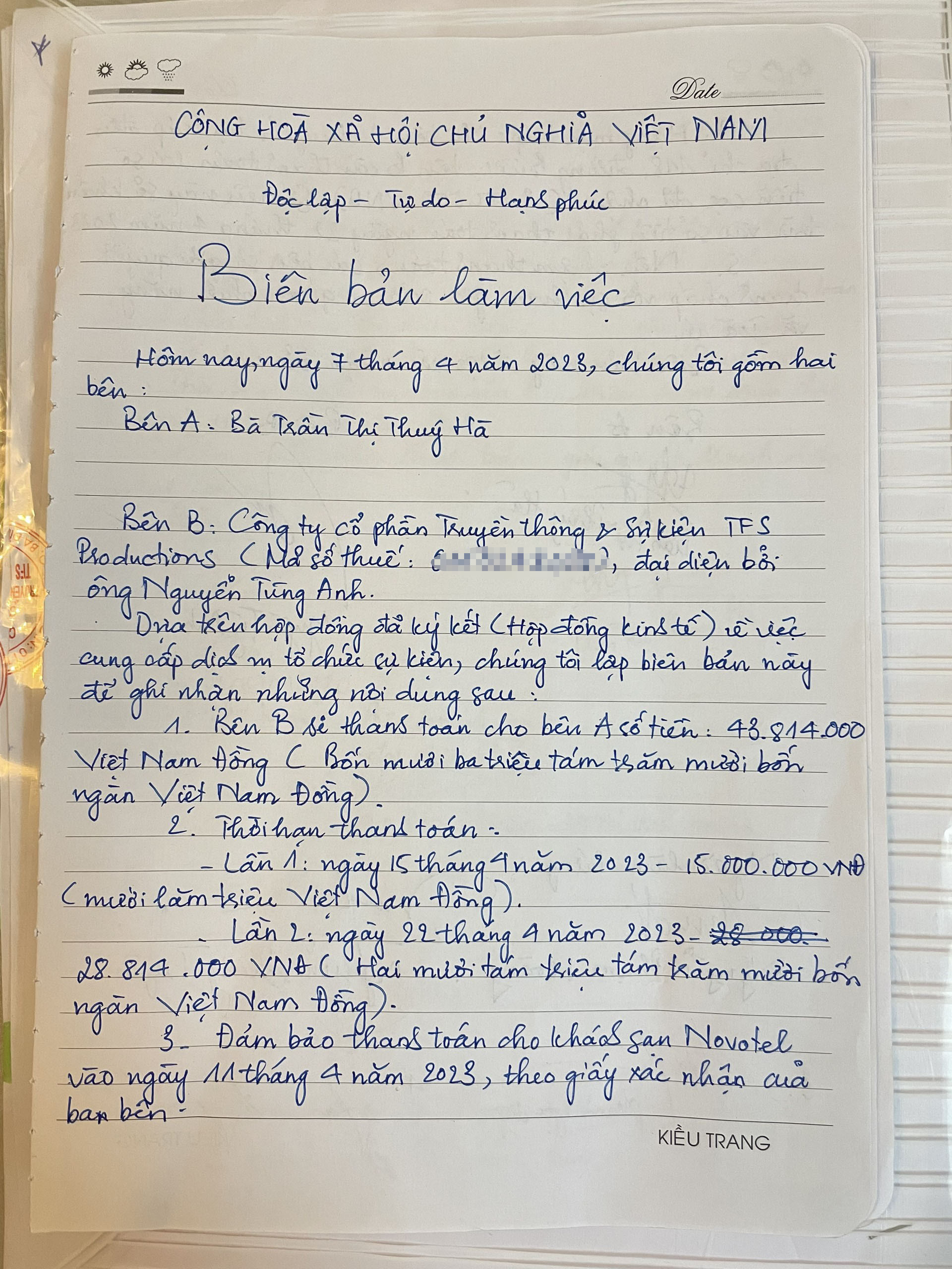 Sau khi đám cưới kết thúc, ngày 7/4, đã có một cuộc gặp 3 bên giữa chị Hà, chị Ngọc Anh và đại diện khách sạn Novotel. “Tại đây, chị Ngọc Anh ký cam kết sẽ hoàn trả cho tôi số tiền 43,8 triệu đồng gồm tiền khách sạn và nhiều hạng mục làm thiếu, làm sai, đồng thời thanh toán cho khách sạn Novotel tiền phòng để khách sạn trả lại tiền cho tôi. Thời gian hoàn tiền cho tôi đợt 1 là ngày 15/4: 15 triệu đồng, đợt 2 là ngày 22/4: 28,8 triệu đồng. Thời gian hoàn tiền cho khách sạn Novetel là ngày 11/4”.