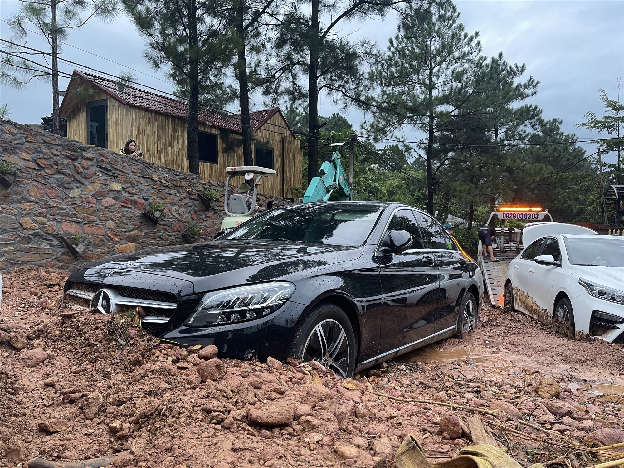 Do mưa lớn, đất đá từ trên đồi kéo xuống tích tụ thành đống lớn trên đường bê tông, nên có nhiều xe ô tô mắc kẹt tới 9-10 tiếng đồng hồ tại khu vực này. Điều này khiến máy móc, linh kiện bên trong xe và phần thân vỏ ít nhiều bị hư hỏng.