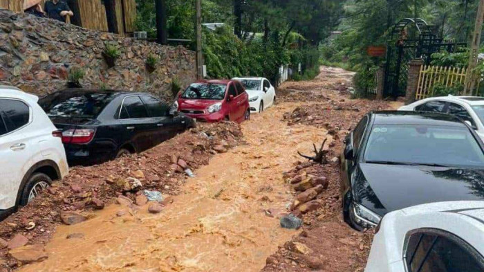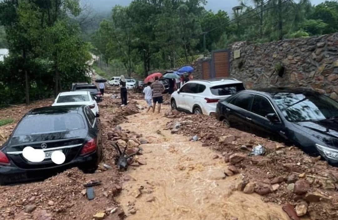 Mưa lớn kéo dài tại Hà Nội những ngày qua khiến bùn đất như lũ quét tràn xuống tuyến đường dân sinh ở Sóc Sơn. Hàng loạt ô tô của khách nghỉ dưỡng đậu hai bên đường bị đất đá vùi lấp không thể di chuyển. Một số xe thậm chí bị bùn đất nhấn chìm quá nửa thân xe.