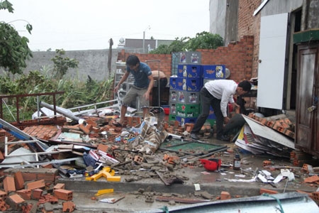 Người dân thu dọn nhà cửa sau trận lốc xoáy - Ảnh: G.BẢO |