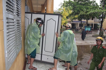 Dân quân giúp chuyển tủ hồ sơ tại trường TH Trần Quốc Toản - Ảnh: G.Bảo |