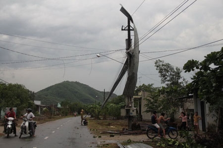 Nhiều mái tôn bị vướng trên trụ điện - Ảnh: G.Bảo |