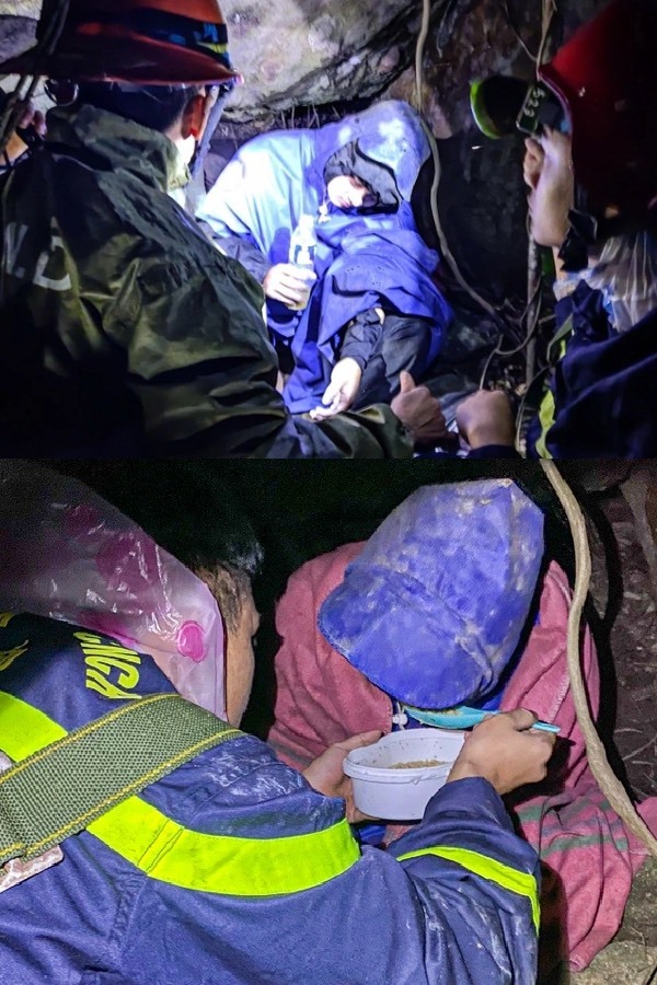 Lúc này, nạn nhân trong tình trạng đa chấn thương, người lả đi vì đói và rét. Cán bộ, chiến sĩ cứu nạn cuốn chăn ấm, tiếp nước và cho nạn nhân ăn mì tôm lấy lại sức.