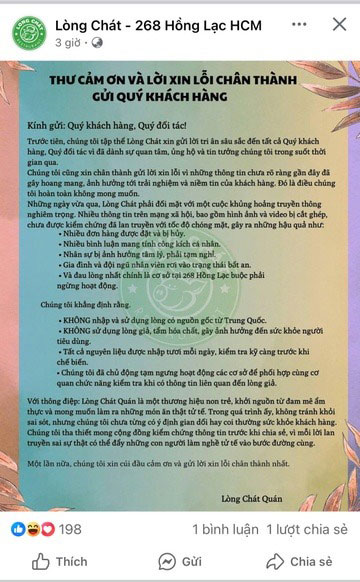Theo đó, ngày 23/5, fanpage chính thức “Lòng Chát - 268 Hồng Lạc HCM" đã đăng tải thư cảm ơn và xin lỗi khách hàng vì những thông tin chưa rõ ràng đã gây ra những hoang mang và ảnh hưởng tới trải nghiệm của khách hàng.