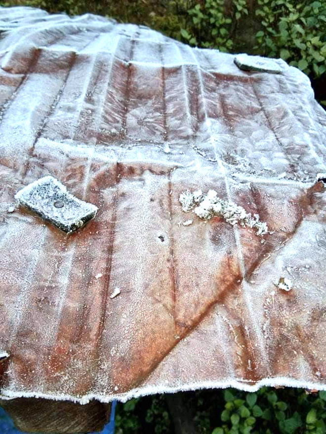 Cụ thể, đêm 5/12 và sáng sớm 6/12 nhiệt độ tại một số khu vực ở bản Buộc Mú (xã Na Ngoi) xuống rất thấp. Khi các cán bộ tại Trạm Kiểm soát Biên phòng Buộc Mú ra ngoài thì phát hiện 1 lớp băng mỏng phủ trên các lá cây, mái nhà, mặt đất.