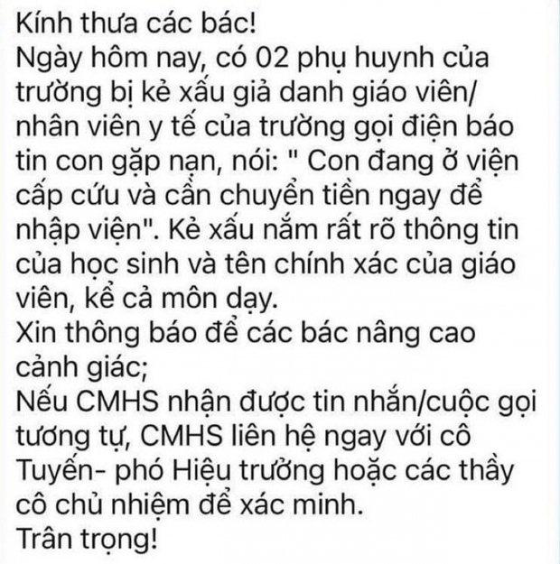 Thời gian gần đây, công an các địa phương liên tiếp nhận đơn trình báo của phụ huynh học sinh nhận được cuộc gọi từ đối tượng lạ tự xưng là giáo viên thông báo con, người thân bị tai nạn tại trường, đang đi cấp cứu tại bệnh viện. Các đối tượng yêu cầu phụ huynh chuyển tiền gấp vào tài khoản do đối tượng chỉ định để làm thủ tục nhập viện, phẫu thuật sau đó chiếm đoạt tài sản.