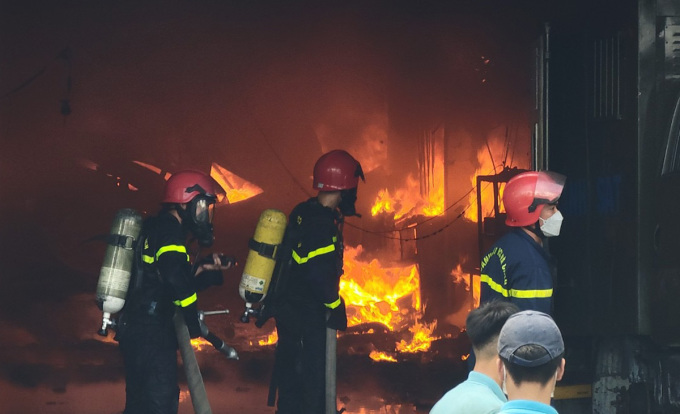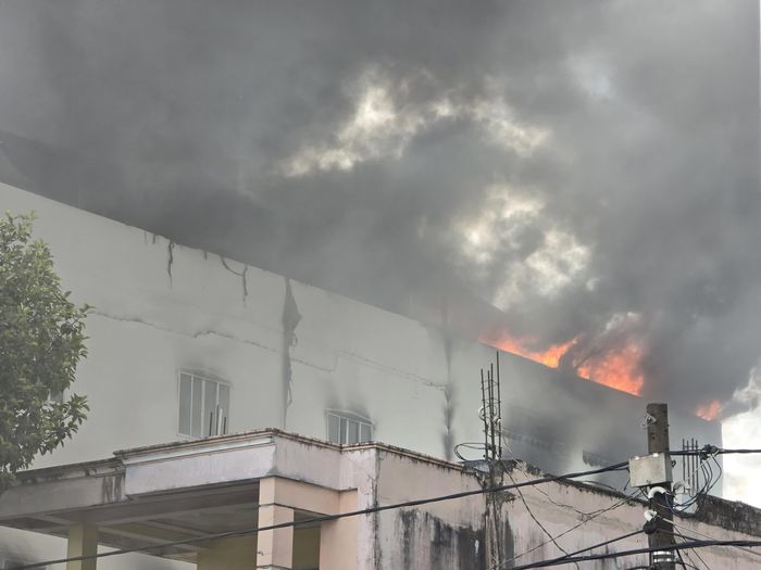 Do bên trong gara có nhiều vật liệu, hàng hóa dễ cháy, lửa bùng phát mạnh, bao trùm gara rộng hàng trăm m2, gió lớn khiến khói bốc cao hàng chục mét.
