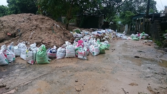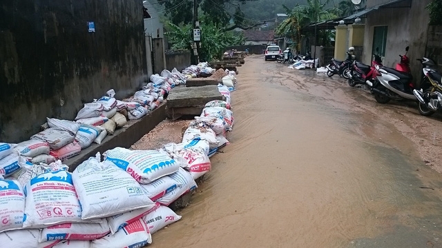 | Nước mưa cùng bùn đất tràn xuống khu dân cư. Rút kinh nghiệm lần trước, lần này người dân đã chủ động xếp các bao cát để chặn bùn đất cao như "chiến lũy" nên thiệt hại đã giảm đi rất nhiều. |