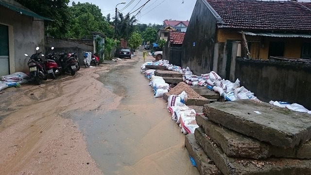 | Giữa trời mưa, dân phải gọi nhau đi khơi thông cống. |