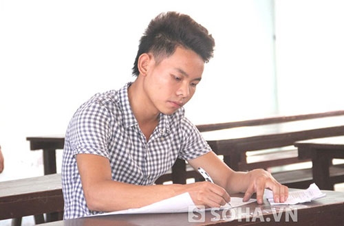 Ngồi 1 mình trong phòng thi, Hải luôn tươi cười và tự tin với chính mình để cố gắng hoàn thành tốt bài thi. |