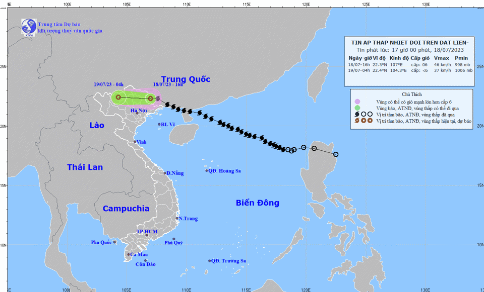 Trong đêm nay, áp thấp nhiệt đới di chuyển theo hướng Tây, mỗi giờ đi được khoảng 20km và tiếp tục suy yếu thành một vùng áp thấp và tan dần. Đến 4h sáng mai, 19/7, vùng áp thấp ở vào khoảng 22,4 độ Vĩ Bắc-104,3 độ Kinh Đông, trên khu vực Việt Bắc.