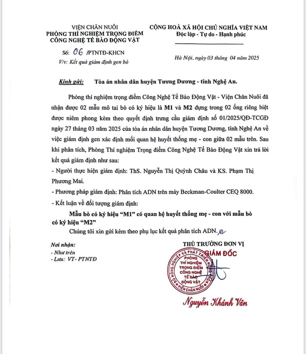 Sau khi nhận đơn yêu cầu phân định tài sản, phía TAND huyện Tương Dương đã phối hợp với chính quyền địa phương xã Yên Hòa lấy mẫu ADN của bò. Kết quả giám định cho thấy, con bò tranh chấp thuộc sở hữu của hộ bà La Thị Ỏn.